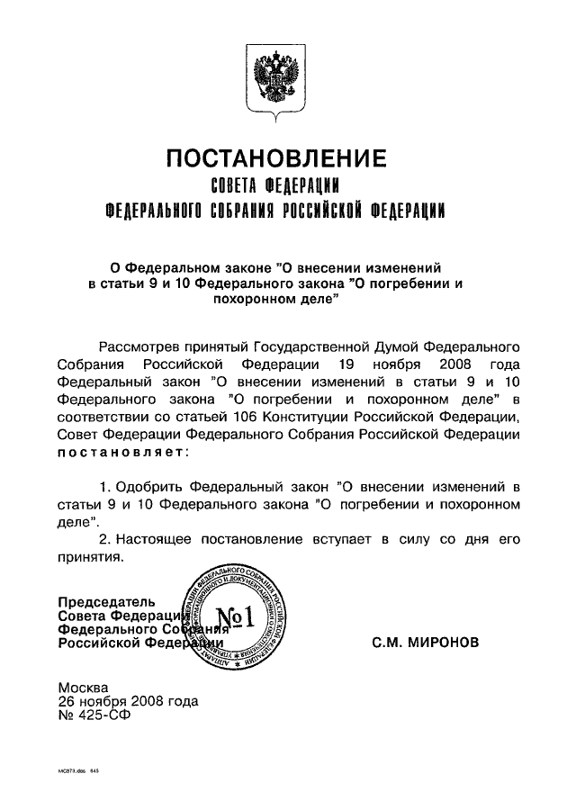ПОСТАНОВЛЕНИЕ СФ ФС РФ от 26.11.2008 N 425-СФ