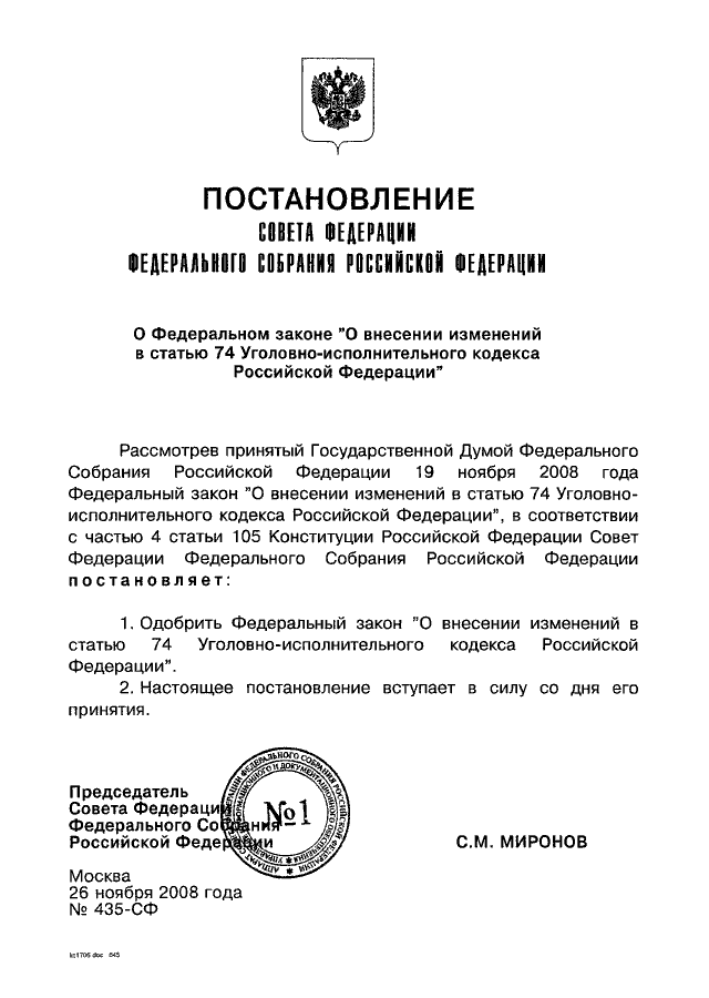 ПОСТАНОВЛЕНИЕ СФ ФС РФ от 26.11.2008 N 435-СФ