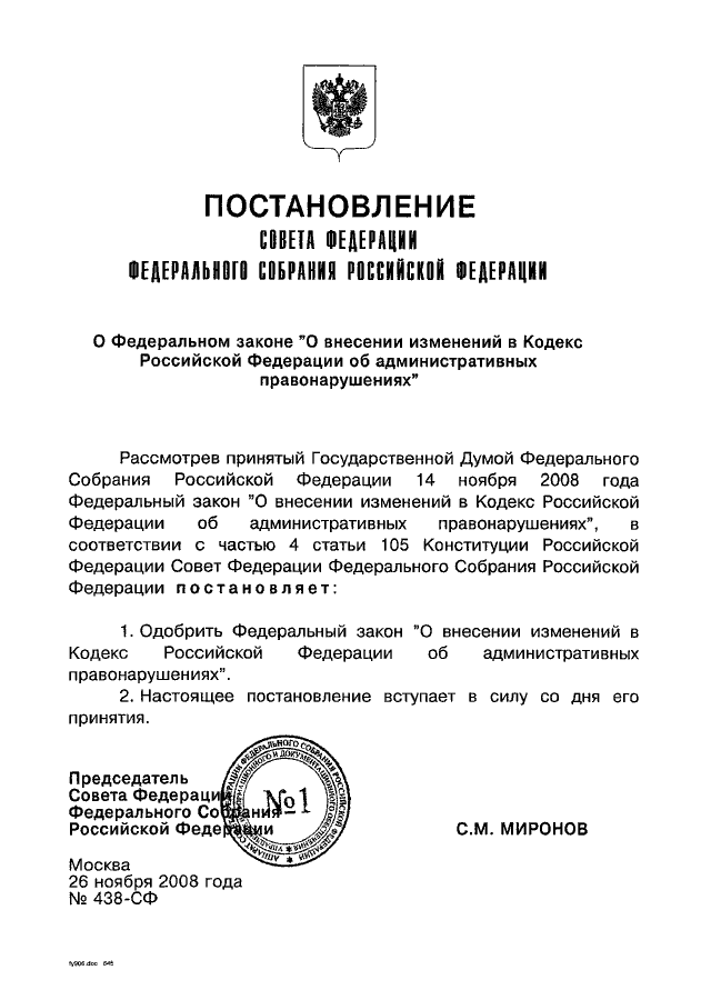 ПОСТАНОВЛЕНИЕ СФ ФС РФ от 26.11.2008 N 438-СФ