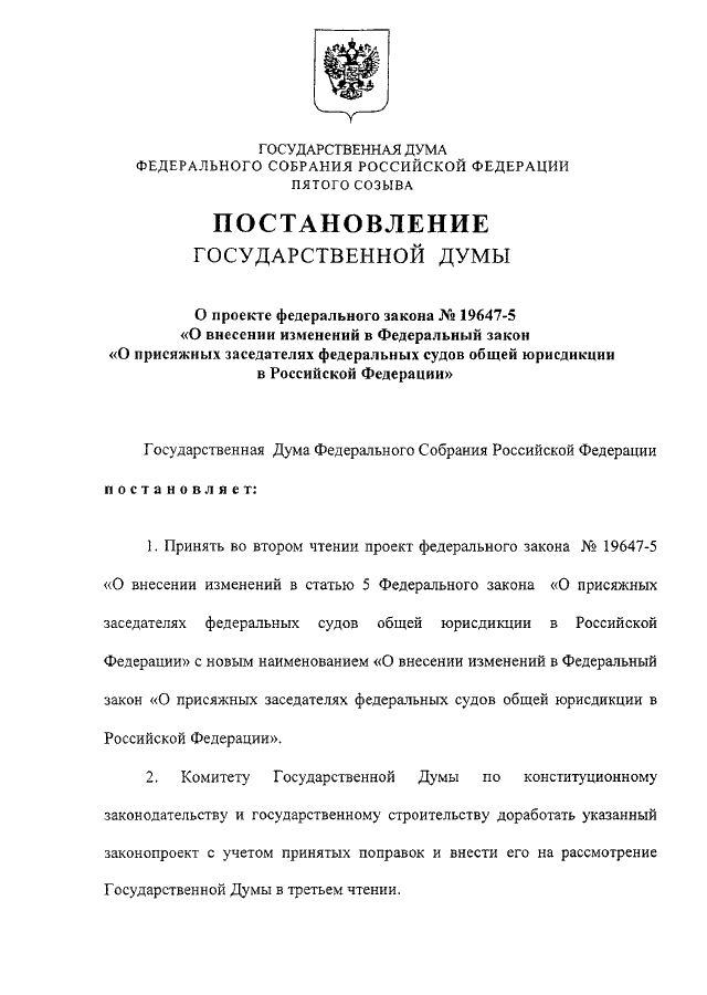 "О ПРОЕКТЕ ФЕДЕРАЛЬНОГО ЗАКОНА N 19647-5 "О ВНЕСЕНИИ ИЗМЕНЕНИЙ В ФЕДЕРАЛЬНЫЙ ЗАКОН "О ПРИСЯЖНЫХ ЗАСЕДАТЕЛЯХ ФЕДЕРАЛЬНЫХ СУДОВ ОБЩЕЙ ЮРИСДИКЦИИ В РОССИЙСКОЙ ФЕДЕРАЦИИ"