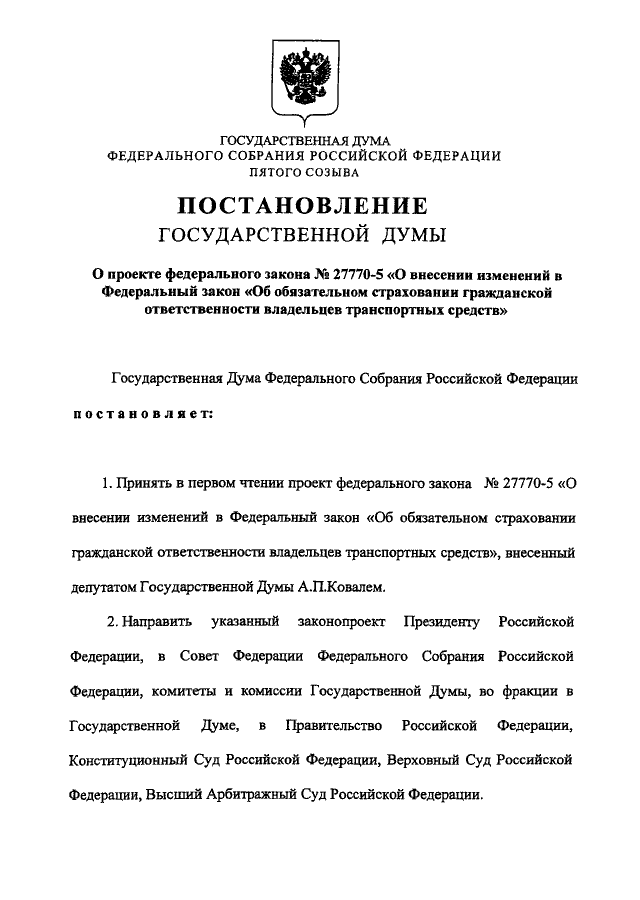 "О ПРОЕКТЕ ФЕДЕРАЛЬНОГО ЗАКОНА N 27770-5 "О ВНЕСЕНИИ ИЗМЕНЕНИЙ В ФЕДЕРАЛЬНЫЙ ЗАКОН "ОБ ОБЯЗАТЕЛЬНОМ СТРАХОВАНИИ ГРАЖДАНСКОЙ ОТВЕТСТВЕННОСТИ ВЛАДЕЛЬЦЕВ ТРАНСПОРТНЫХ СРЕДСТВ"