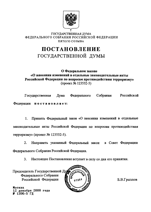 ПОСТАНОВЛЕНИЕ ГД ФС РФ от 12.12.2008 N 1396-5 ГД