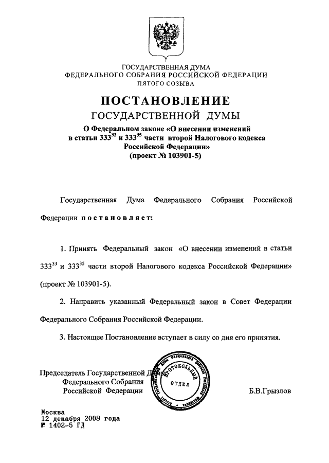 "О ФЕДЕРАЛЬНОМ ЗАКОНЕ "О ВНЕСЕНИИ ИЗМЕНЕНИЙ В СТАТЬИ 333.33 И 333.35 ЧАСТИ ВТОРОЙ НАЛОГОВОГО КОДЕКСА РОССИЙСКОЙ ФЕДЕРАЦИИ" (ПРОЕКТ N 103901-5)"