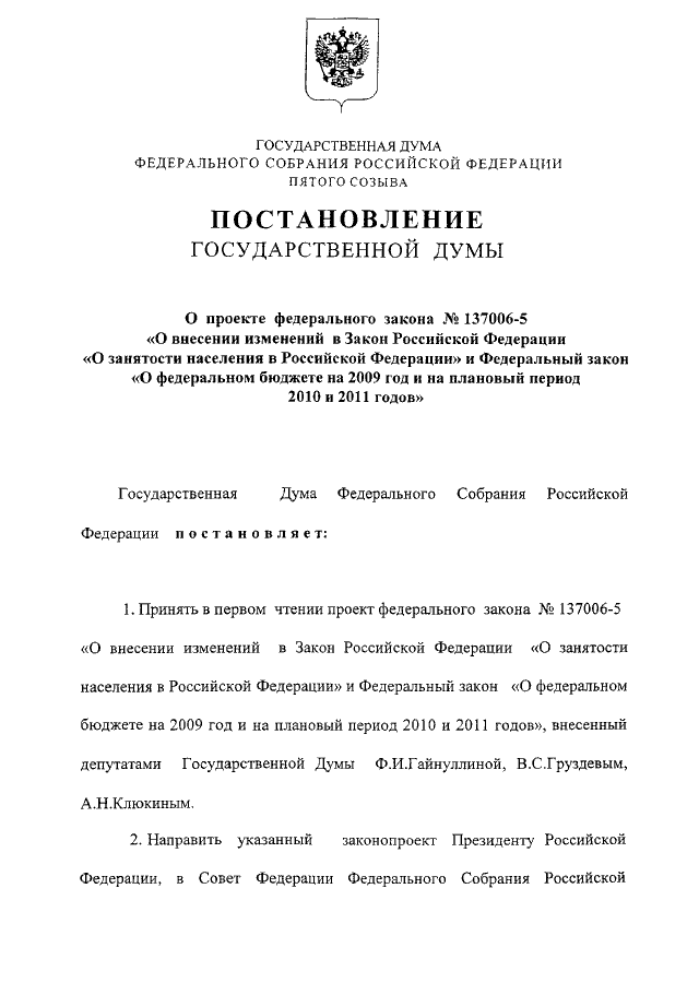 "О ПРОЕКТЕ ФЕДЕРАЛЬНОГО ЗАКОНА N 137006-5 "О ВНЕСЕНИИ ИЗМЕНЕНИЙ В