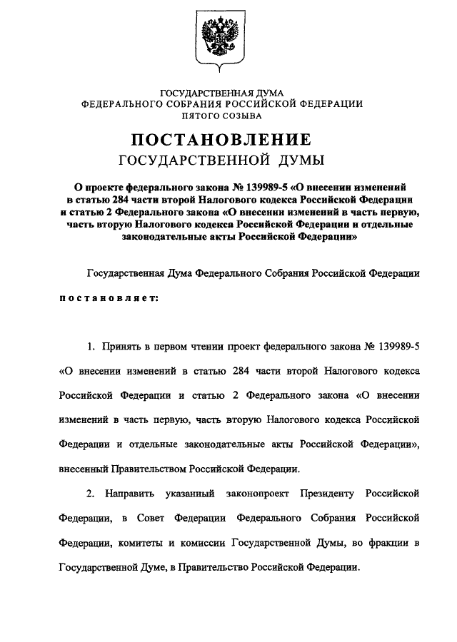 "О ПРОЕКТЕ ФЕДЕРАЛЬНОГО ЗАКОНА N 139989-5 "О ВНЕСЕНИИ ИЗМЕНЕНИЙ В СТАТЬЮ 284 ЧАСТИ ВТОРОЙ НАЛОГОВОГО КОДЕКСА РОССИЙСКОЙ ФЕДЕРАЦИИ И СТАТЬЮ 2 ФЕДЕРАЛЬНОГО ЗАКОНА "О ВНЕСЕНИИ ИЗМЕНЕНИЙ В ЧАСТЬ ПЕРВУЮ, ЧАСТЬ ВТОРУЮ НАЛОГОВОГО КОДЕКСА РОССИЙСКОЙ ФЕДЕРАЦИИ И ОТДЕЛЬНЫЕ ЗАКОНОДАТЕЛЬНЫЕ АКТЫ РОССИЙСКОЙ ФЕДЕРАЦИИ"