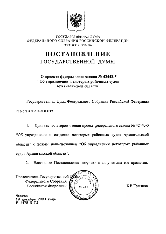 ПОСТАНОВЛЕНИЕ ГД ФС РФ от 19.12.2008 N 1478-5 ГД