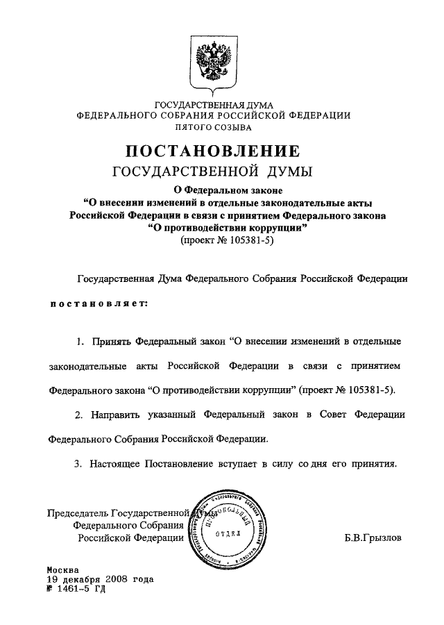 ПОСТАНОВЛЕНИЕ ГД ФС РФ от 19.12.2008 N 1461-5 ГД