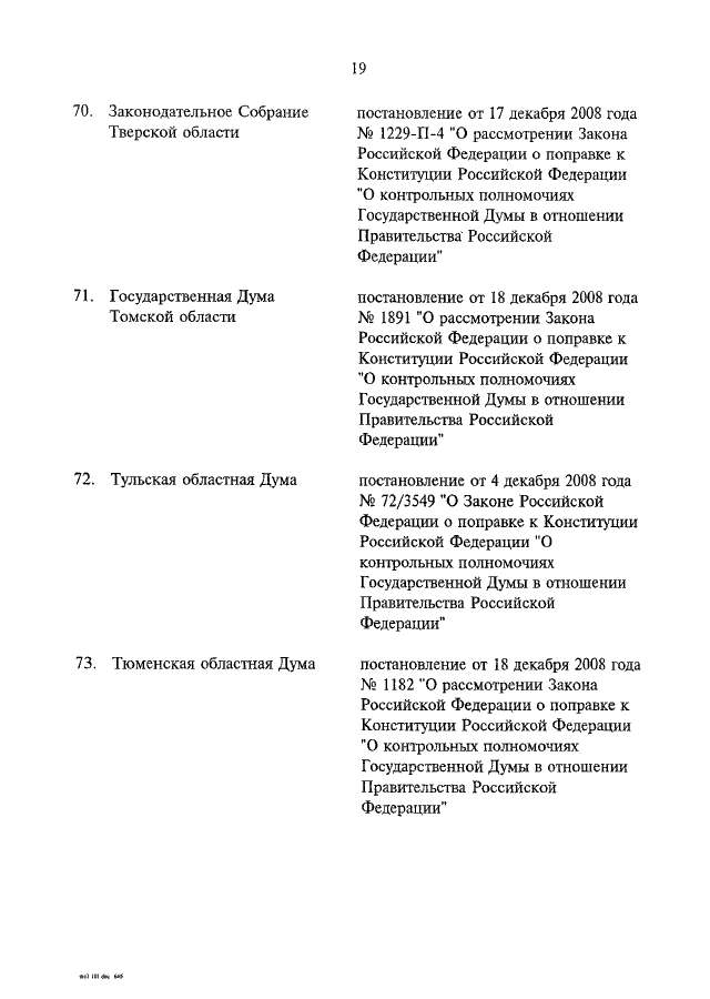 "ОБ УСТАНОВЛЕНИИ РЕЗУЛЬТАТОВ РАССМОТРЕНИЯ ЗАКОНОДАТЕЛЬНЫМИ (ПРЕДСТАВИТЕЛЬНЫМИ) ОРГАНАМИ ГОСУДАРСТВЕННОЙ ВЛАСТИ СУБЪЕКТОВ РОССИЙСКОЙ ФЕДЕРАЦИИ ЗАКОНА РОССИЙСКОЙ ФЕДЕРАЦИИ О ПОПРАВКЕ К КОНСТИТУЦИИ РОССИЙСКОЙ ФЕДЕРАЦИИ "О КОНТРОЛЬНЫХ ПОЛНОМОЧИЯХ ГОСУДАРСТВЕННОЙ ДУМЫ В ОТНОШЕНИИ ПРАВИТЕЛЬСТВА РОССИЙСКОЙ ФЕДЕРАЦИИ"