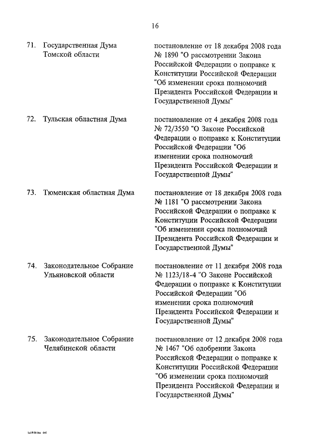 "ОБ УСТАНОВЛЕНИИ РЕЗУЛЬТАТОВ РАССМОТРЕНИЯ ЗАКОНОДАТЕЛЬНЫМИ (ПРЕДСТАВИТЕЛЬНЫМИ) ОРГАНАМИ ГОСУДАРСТВЕННОЙ ВЛАСТИ СУБЪЕКТОВ РОССИЙСКОЙ ФЕДЕРАЦИИ ЗАКОНА РОССИЙСКОЙ ФЕДЕРАЦИИ О ПОПРАВКЕ К КОНСТИТУЦИИ РОССИЙСКОЙ ФЕДЕРАЦИИ "ОБ ИЗМЕНЕНИИ СРОКА ПОЛНОМОЧИЙ ПРЕЗИДЕНТА РОССИЙСКОЙ ФЕДЕРАЦИИ И ГОСУДАРСТВЕННОЙ ДУМЫ"