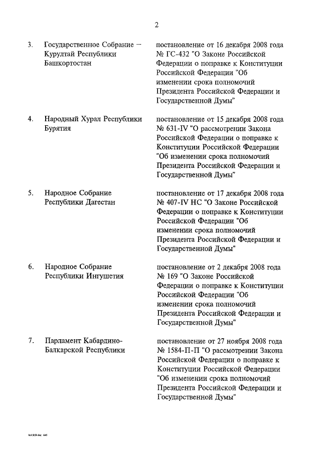 "ОБ УСТАНОВЛЕНИИ РЕЗУЛЬТАТОВ РАССМОТРЕНИЯ ЗАКОНОДАТЕЛЬНЫМИ (ПРЕДСТАВИТЕЛЬНЫМИ) ОРГАНАМИ ГОСУДАРСТВЕННОЙ ВЛАСТИ СУБЪЕКТОВ РОССИЙСКОЙ ФЕДЕРАЦИИ ЗАКОНА РОССИЙСКОЙ ФЕДЕРАЦИИ О ПОПРАВКЕ К КОНСТИТУЦИИ РОССИЙСКОЙ ФЕДЕРАЦИИ "ОБ ИЗМЕНЕНИИ СРОКА ПОЛНОМОЧИЙ ПРЕЗИДЕНТА РОССИЙСКОЙ ФЕДЕРАЦИИ И ГОСУДАРСТВЕННОЙ ДУМЫ"