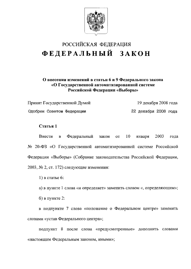 "О ВНЕСЕНИИ ИЗМЕНЕНИЙ В СТАТЬИ 6 И 9 ФЕДЕРАЛЬНОГО ЗАКОНА "О ГОСУДАРСТВЕННОЙ АВТОМАТИЗИРОВАННОЙ СИСТЕМЕ РОССИЙСКОЙ ФЕДЕРАЦИИ "ВЫБОРЫ"