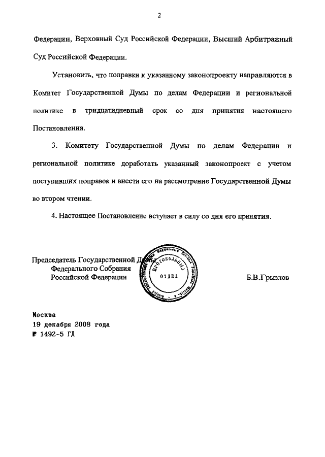 ПОСТАНОВЛЕНИЕ ГД ФС РФ от 19.12.2008 N 1492-5 ГД