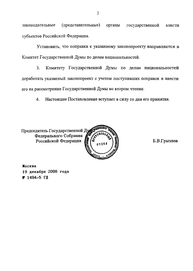 ПОСТАНОВЛЕНИЕ ГД ФС РФ от 19.12.2008 N 1494-5 ГД