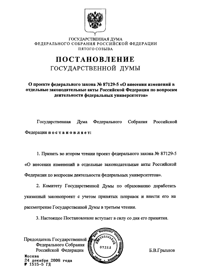 ПОСТАНОВЛЕНИЕ ГД ФС РФ от 24.12.2008 N 1515-5 ГД