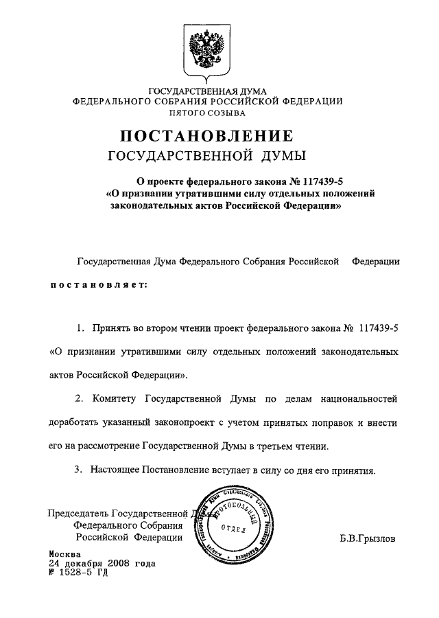 ПОСТАНОВЛЕНИЕ ГД ФС РФ от 24.12.2008 N 1528-5 ГД
