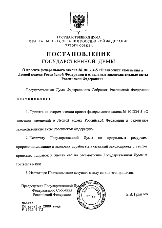 ПОСТАНОВЛЕНИЕ ГД ФС РФ от 24.12.2008 N 1522-5 ГД