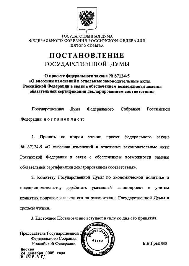 ПОСТАНОВЛЕНИЕ ГД ФС РФ от 24.12.2008 N 1516-5 ГД