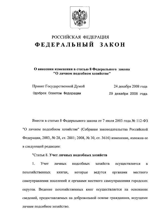 "О ВНЕСЕНИИ ИЗМЕНЕНИЯ В СТАТЬЮ 8 ФЕДЕРАЛЬНОГО ЗАКОНА "О ЛИЧНОМ ПОДСОБНОМ ХОЗЯЙСТВЕ"