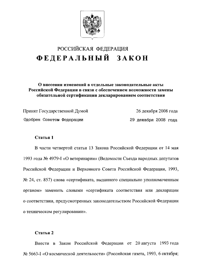 "О ВНЕСЕНИИ ИЗМЕНЕНИЙ В ОТДЕЛЬНЫЕ ЗАКОНОДАТЕЛЬНЫЕ АКТЫ РОССИЙСКОЙ ФЕДЕРАЦИИ В СВЯЗИ С ОБЕСПЕЧЕНИЕМ ВОЗМОЖНОСТИ ЗАМЕНЫ ОБЯЗАТЕЛЬНОЙ СЕРТИФИКАЦИИ ДЕКЛАРИРОВАНИЕМ СООТВЕТСТВИЯ"