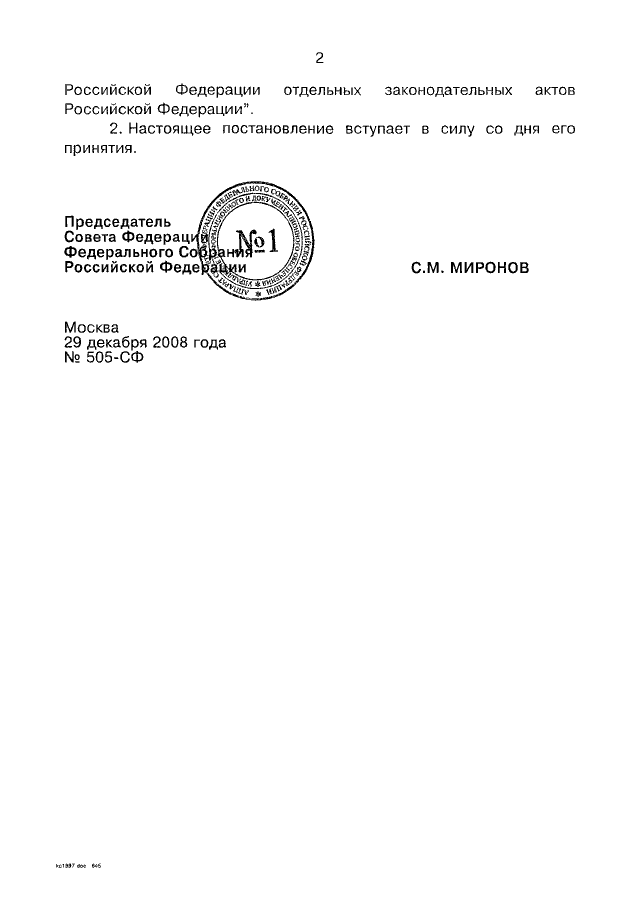 ПОСТАНОВЛЕНИЕ СФ ФС РФ от 29.12.2008 N 505-СФ