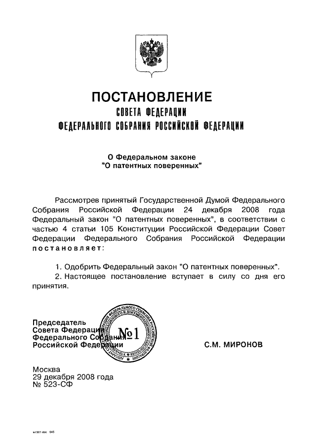 ПОСТАНОВЛЕНИЕ СФ ФС РФ от 29.12.2008 N 523-СФ