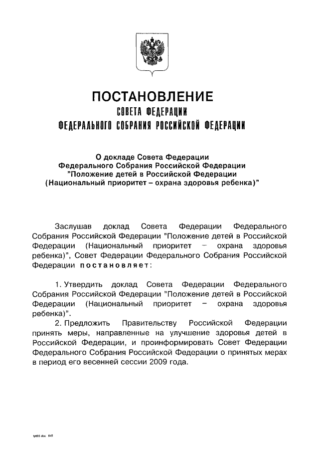 "О ДОКЛАДЕ СОВЕТА ФЕДЕРАЦИИ ФЕДЕРАЛЬНОГО СОБРАНИЯ РОССИЙСКОЙ ФЕДЕРАЦИИ "ПОЛОЖЕНИЕ ДЕТЕЙ В РОССИЙСКОЙ ФЕДЕРАЦИИ (НАЦИОНАЛЬНЫЙ ПРИОРИТЕТ - ОХРАНА ЗДОРОВЬЯ РЕБЕНКА)"