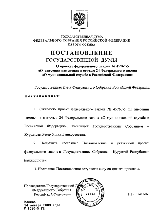 ПОСТАНОВЛЕНИЕ ГД ФС РФ от 14.01.2009 N 1580-5 ГД